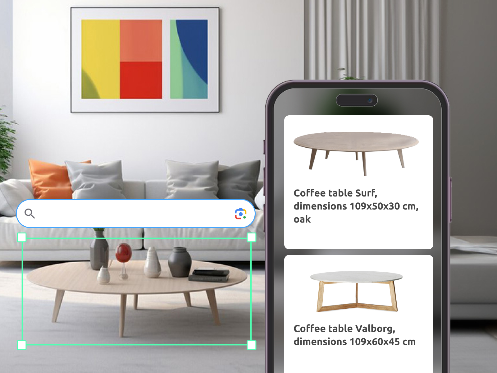 Пример: Клиентът качва снимка на стилна дървена маса и AI намира подобни модели в каталога, препоръчвайки: "Намерихме 3 подобни маси във вашия бюджет." Или клиентът пише: "Търся соларни лампи за градината." Системата предлага съответните артикули с наличност и цени.